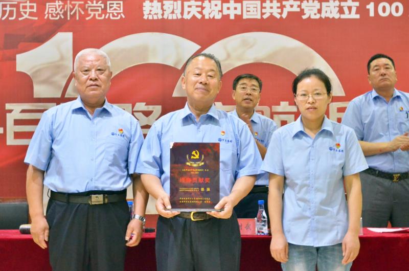 退休老干部代表梁景曉和一線職工代表張志娟向黨委書記苗強同志頒發(fā)終身貢獻獎牌。