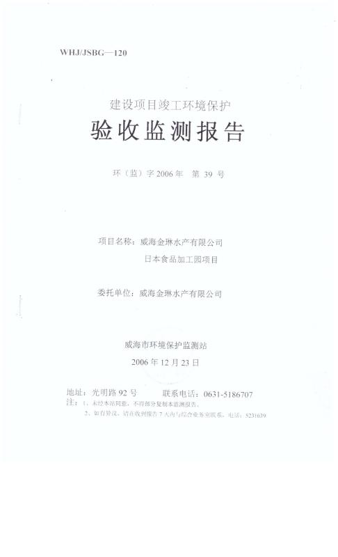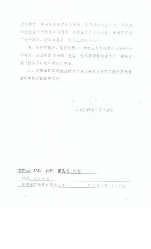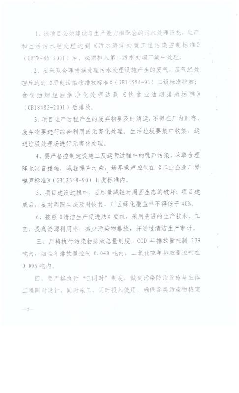 公司于2003年成立時(shí),投資400余萬元建成日處理能力1000噸的二級污水處理廠,并于2006年由威海市環(huán)境保護(hù)監(jiān)測站驗(yàn)收合格后投入運(yùn)行?,F(xiàn)階段運(yùn)行排放的主要污染物為化學(xué)需氧量和氨氮,排放口1個(gè),執(zhí)行污染物排放標(biāo)準(zhǔn)化學(xué)需氧量≤500㎎/L,氨氮≤45㎎/L,運(yùn)行中污染物排放濃度達(dá)到化學(xué)需氧量174㎎/L左右,氨氮19.5㎎/L左右,化學(xué)需氧量和氨氮的年排放總量分別為25噸和3噸左右,核定的化學(xué)需氧量年排放總量控制在239噸內(nèi)。