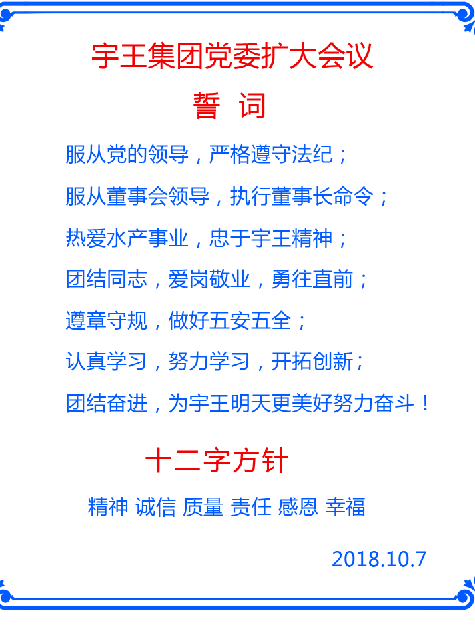 最后,由苗總親擬宇王集團(tuán)黨委誓詞,提出“精神 誠(chéng)信 質(zhì)量 責(zé)任 感恩 幸?!笔址结?,以此作為宇王集團(tuán)黨員行為標(biāo)準(zhǔn)以及集團(tuán)公司全體職工行為模版。全體與會(huì)人員莊重宣誓,此次會(huì)議圓滿結(jié)束。