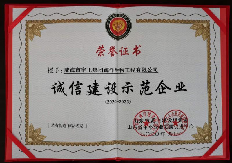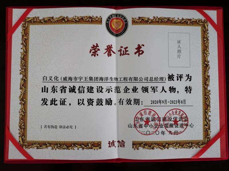 9月28日,學(xué)習(xí)貫徹山東省社會(huì)信用條例暨全省企業(yè)誠(chéng)信建設(shè)示范工作會(huì)議在濟(jì)南召開(kāi)。會(huì)上,宇王集團(tuán)海洋生物工程有限公司榮獲山東省“誠(chéng)信建設(shè)示范企業(yè)",白義化經(jīng)理榮獲“山東省誠(chéng)信建設(shè)示范企業(yè)領(lǐng)軍人物”。